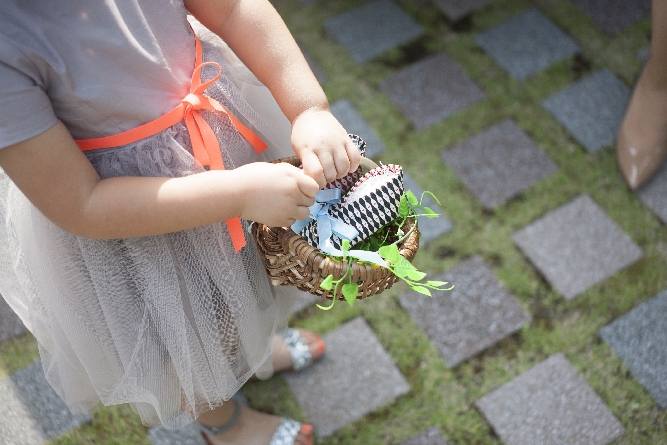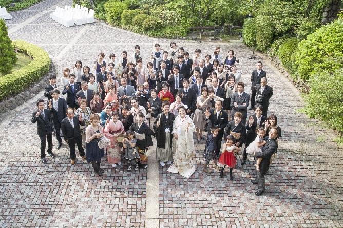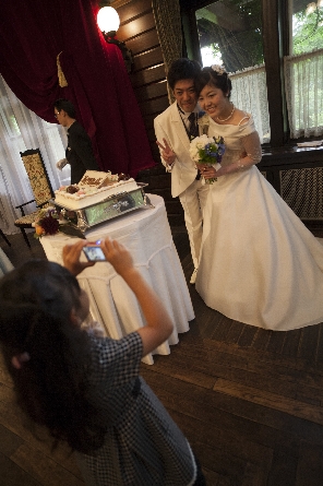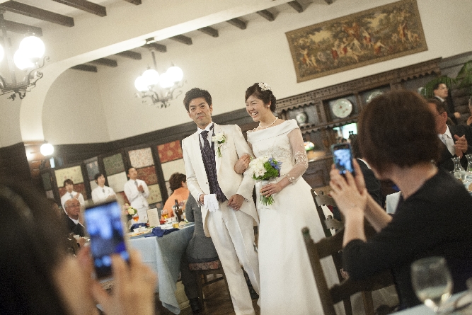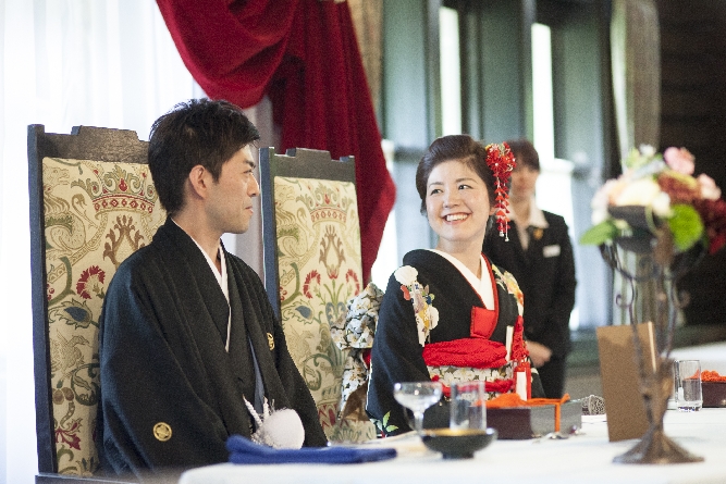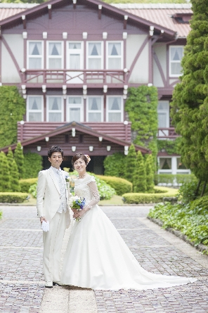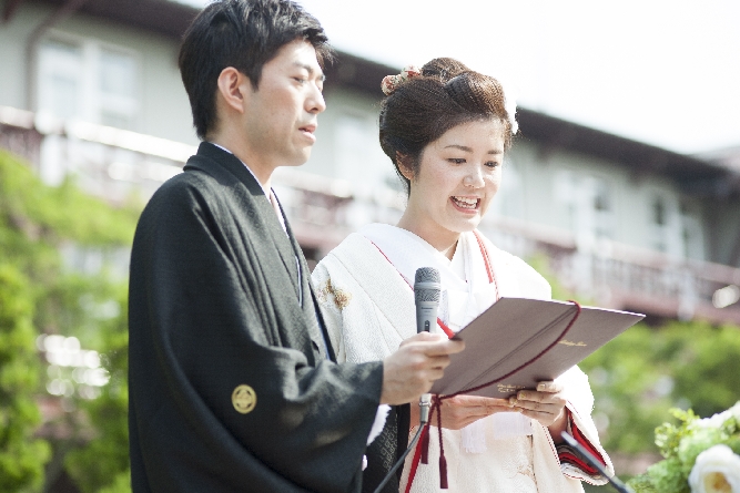 良い天気にも恵まれて、青空の下で参列者の方々に見守られながら、希望していた和装で挙式を行うことができました。手作りのリングピローを新郎の姪に運んでもらうという演出も好評でした。レトロな外観のホテルをバックに、参列者の方々の前で愛を誓うことで、身が引き締まる思いがしました。